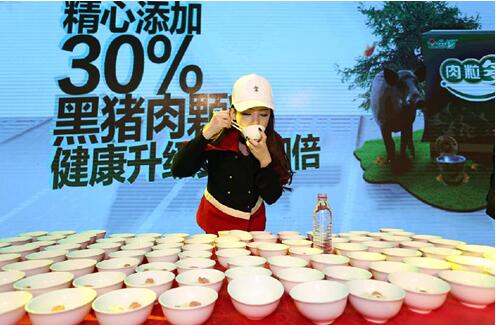 在現場,汪涵更是以無淀粉產品代言人的身份和現場經銷商進行了互動,《豬豬俠》人偶豬豬和菲菲也以金鑼哈啰伙伴系列產品代言人的身份進行了萌翻眾人的表演,《畫江湖之不良人》主創團隊則以cosplay的形象出現在舞臺上,帶來了一場如夢似幻的視覺盛宴。而YY當紅大胃王女主播袁瑞彤PK三壯漢,10分鐘吃下70碗金鑼肉粒多拌面更是將現場氣氛推向高潮;外籍大廚阿爾伯特用德斯克制作三道色香味俱全的德式美食,也讓臺下經銷商欲罷不能。這些豐富的代言形式,讓在場的經銷商全部耳目一新,留下了深刻的品牌印象。也正是在代言人的推動下,短短兩個小時訂貨量便突破了1.15億。